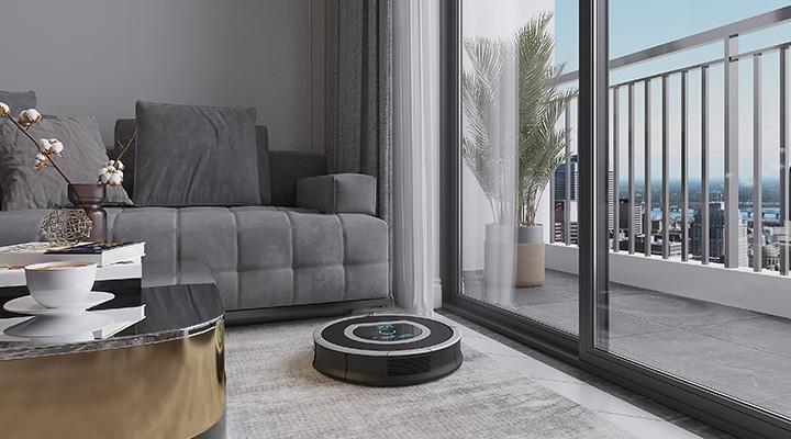 直径32cm、高さ10cmと座布団ほどのスリムサイズで、椅子の下やソファの下でも止まることなく清掃が可能。特徴は、両サイドに備わった長いブラシ。壁際0cmまで届き、細かな埃も掻き取ります。また、吸引力に特化しており、カーペットに絡む小さなゴミからコーンや福神漬けなどの大きめの食べかすまでも清掃します。