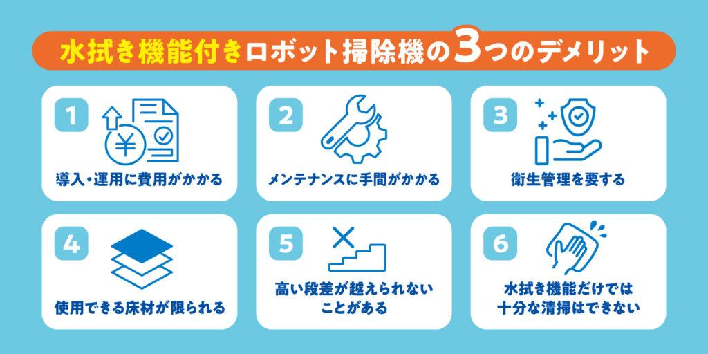 たくさんのメリットがある水拭きタイプのロボット掃除機ですが、その反面、利用上の注意点も存在します。以下では、水拭き機能が搭載されたロボット掃除機のデメリットを、3つの観点からみていきましょう。