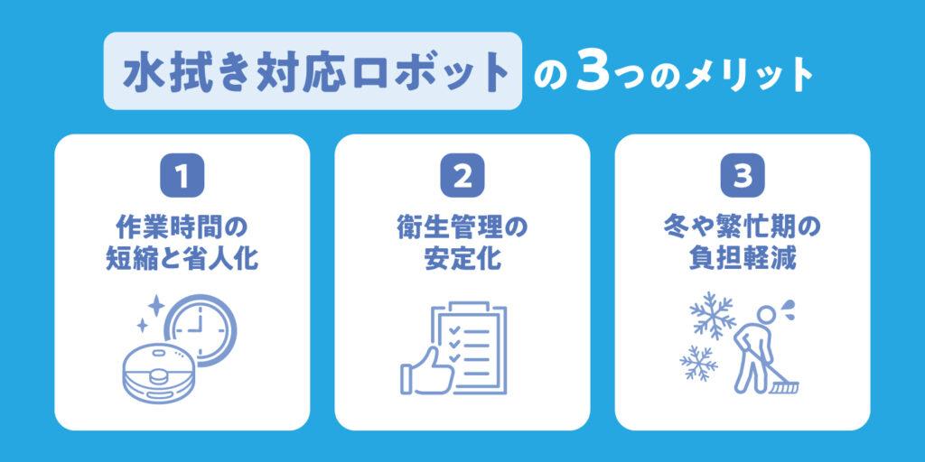 こうした特徴を持つ水拭きロボットは、導入することで次のようなメリットを現場にもたらします。