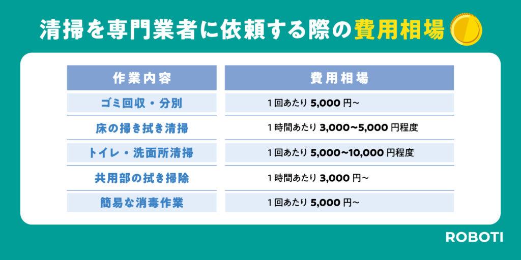 日常清掃を専門業者に外注する場合は、時間単位や回数に応じた料金体系が一般的です。清掃範囲や頻度によって金額は変動しますが、代表的な作業の費用目安は以下のとおりです。