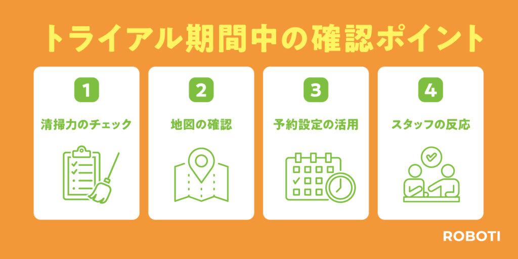 一般的に清掃ロボットのトライアル期間は数日〜1週間。ROBOTIでは基本4日間で実施しています。短期間で本導入の可否を判断するためには、以下4つの点に注目してください。